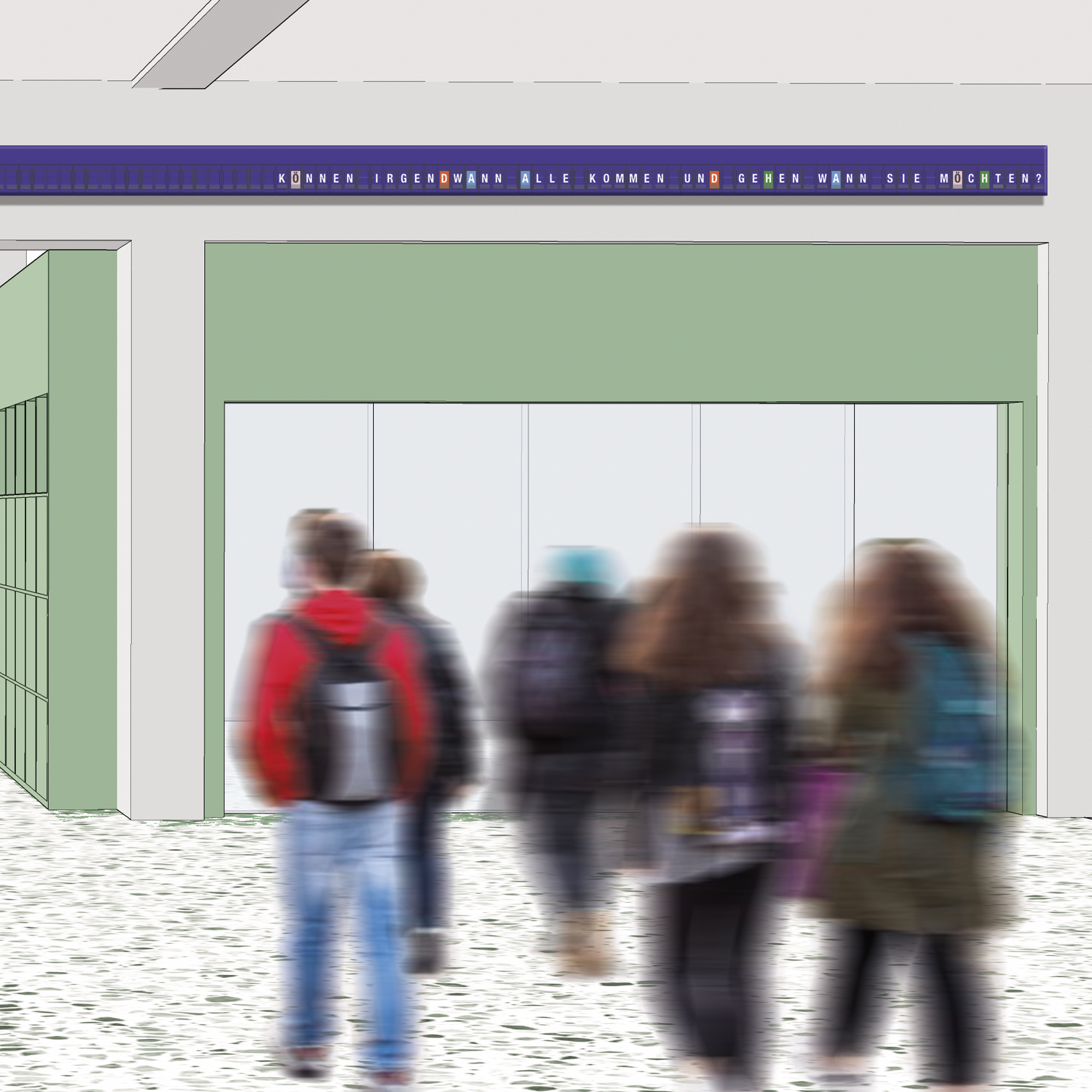Im Eingangsbereich wird ein 14 Meter breites, digital steuerbares, mechanisches Fallblatt-Display installiert. Es wird handgefertigt und bezieht sich in seiner einzigartigen Form direkt auf die Architektur des Schulgebäudes. Auf der Anzeige wird immer eine Frage an „Schule“ zu sehen sein – eine aus Tausenden.